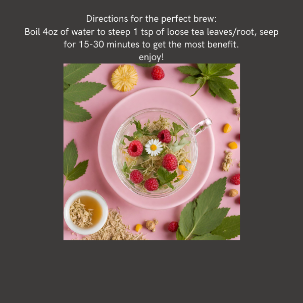 - Bring the water to a boil, then steep 1-2tsp of the herbs in 4oz for 15-30 minutes.